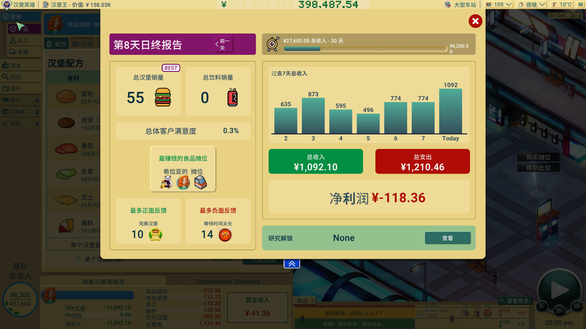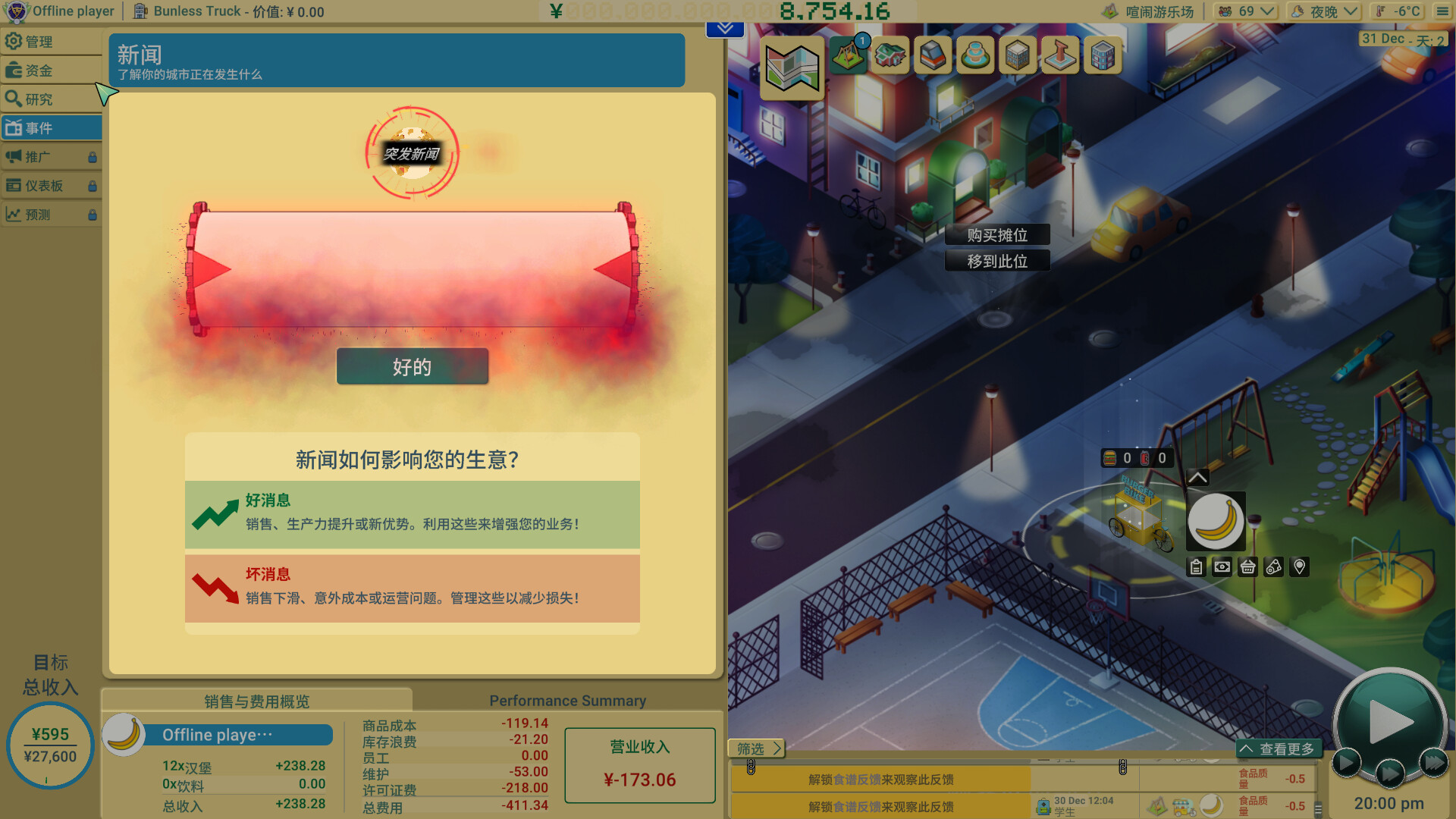 生涯模式:大型企业模式 - 不再局限于街头美食,发展到十几辆餐车、员工管理和后勤调度,真正迈向美食帝国(含多个数据面板)。