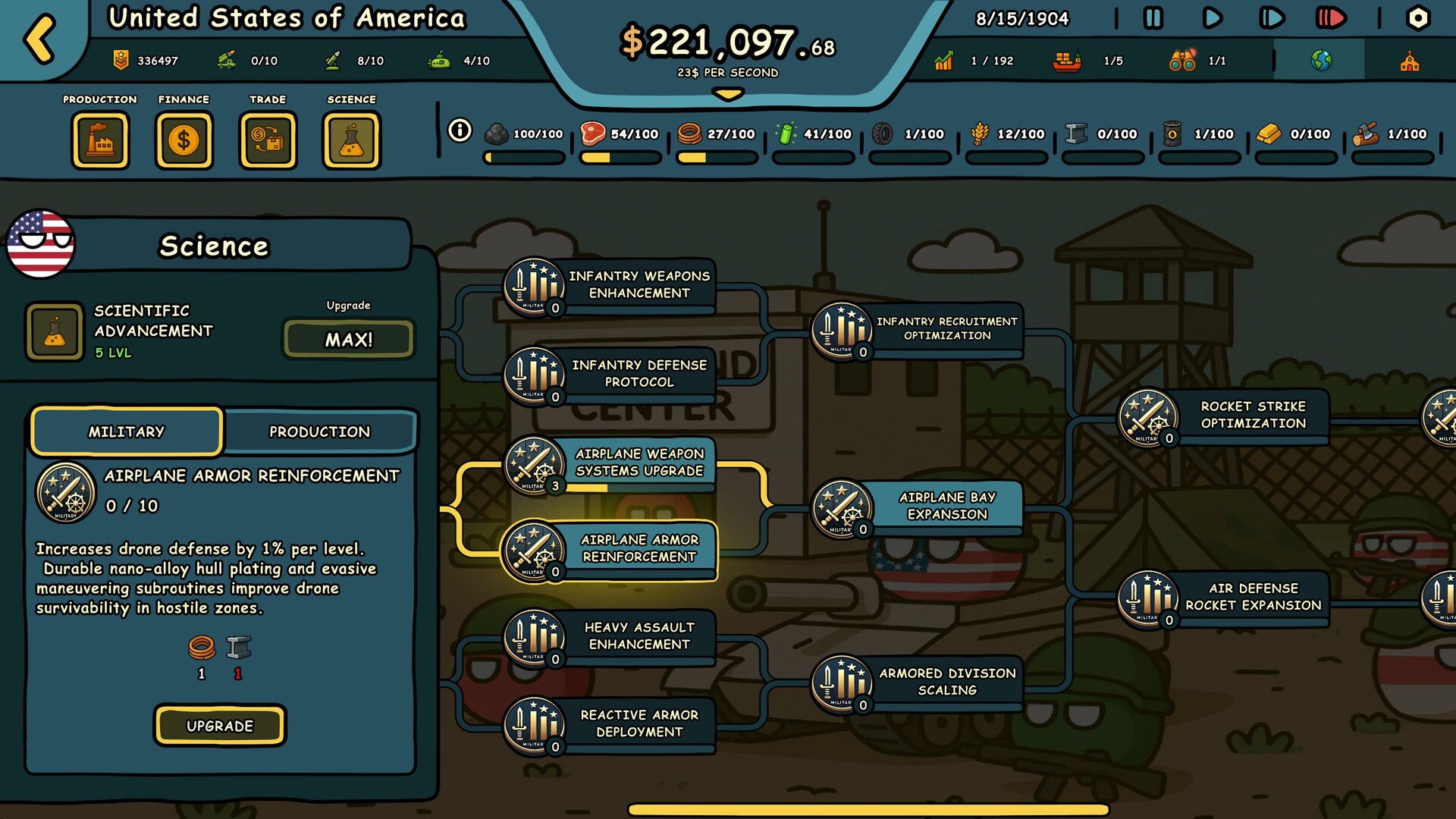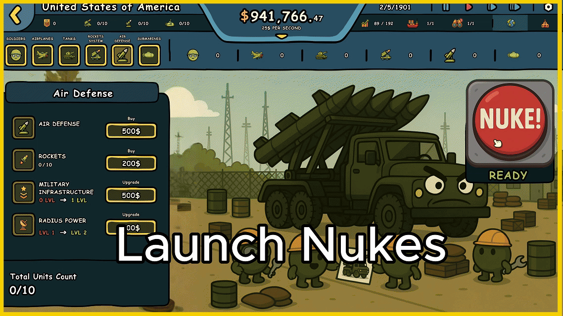 训练夸张风格的军队,部署坦克、战斗机、潜艇、导弹系统——当外交失败时,投下核弹。用荒诞幽默的Countryballs风格统治战场。