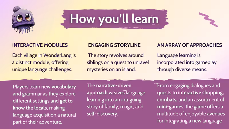 WonderLang 将语言融入其冒险和引人入胜的叙事的核心。沉浸在 Wonderlang 中,因为您:使用目标语言探索、 战斗 、 交谈和调查 。