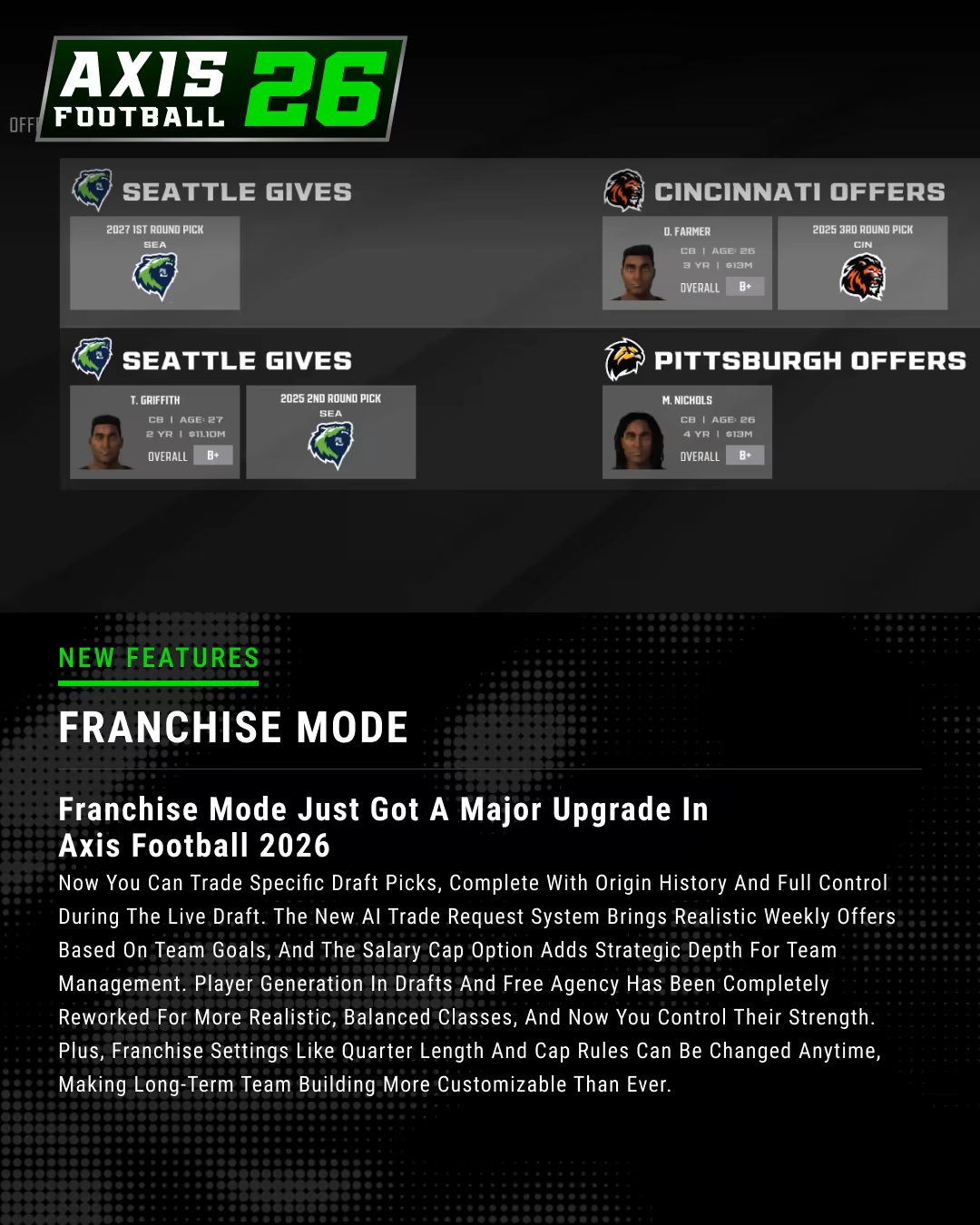 Axis Football 2026 是一款完整的美式足球模拟游戏,具有流畅的游戏玩法、无尽的定制和业界最好的特许经营模式。