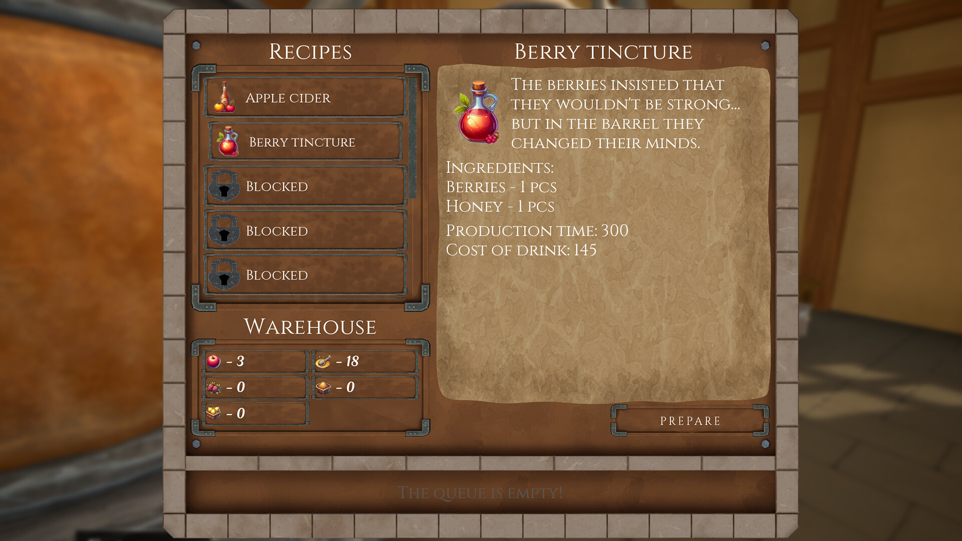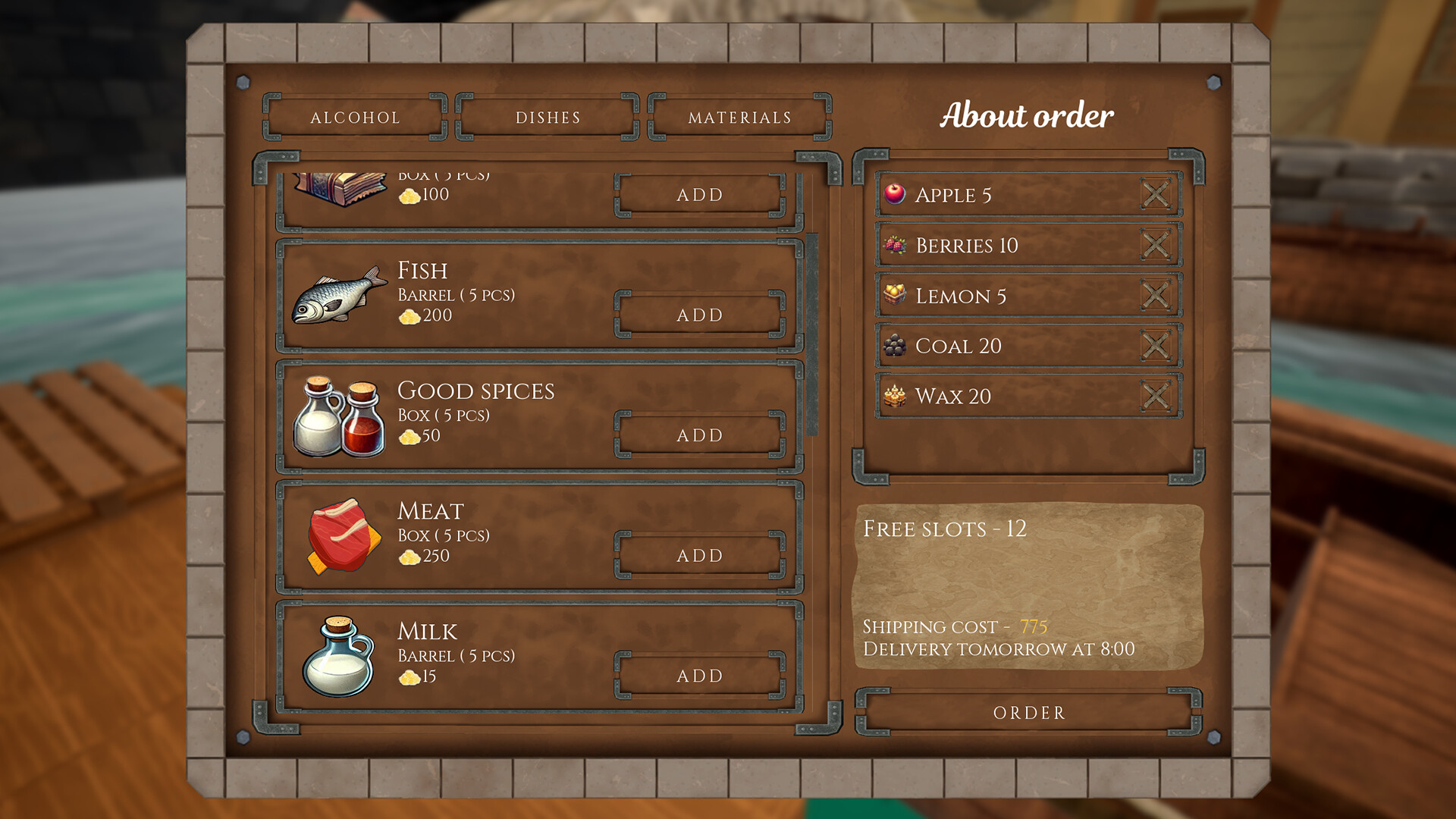 酒馆地下室隐藏着一个奇妙的小码头,你可在此接收货物。从这里可以订购一切所需:食材、照明用的蜡烛、炉火和蒸馏设备用的煤炭,以及用于修复家具的工具(不论是被客人无意中还是故意破坏的)。